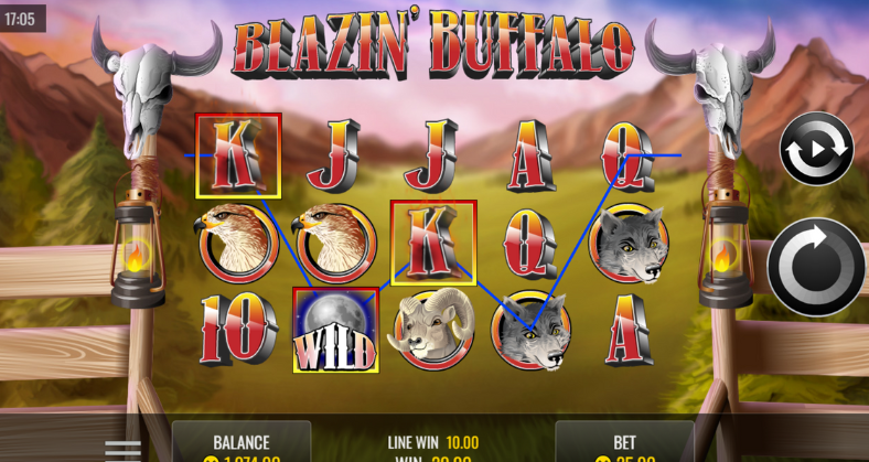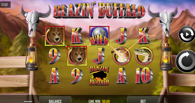 The 5×3 reel grid is classic, with well-drawn animal symbols, including the titular buffalo, some slightly menacing bears, and wolves with eyes like torches. There’s also your classic royals, which don’t do much but help fill the reels. The animals pop against the muted background, and there’s a nice glow effect on winning combinations that adds a bit of oomph to each spin!