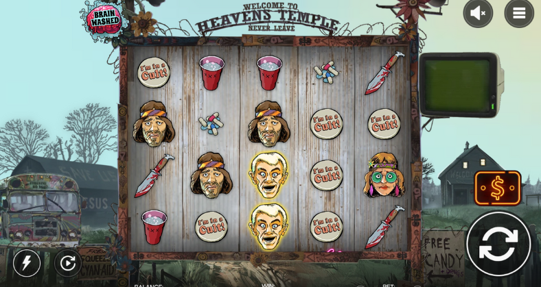 Brainwashed takes place in a drab cult town stuck in a time warp. The 5×4 reel setup uses 30 fixed paylines, triggering wins from left to right. The interface is tight, mobile-friendly, and visually arresting in all the right ways. Symbols range from darkly comical to downright unsettling: think “I’m in a Cult” pins, poisoned mugs, syringes, and deranged cult leaders. The leader is the top-paying symbol, coughing up 20x your stake for five on a line. It’s wild, but never messy, every spin feels deliberate.